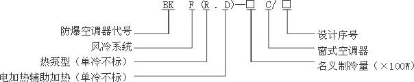 BKFRD-35C/JP的意义为:输入电源为120V/60Hz的热泵带辅助电加热型军用窗式防爆空调器,名义制冷量3500W。 |