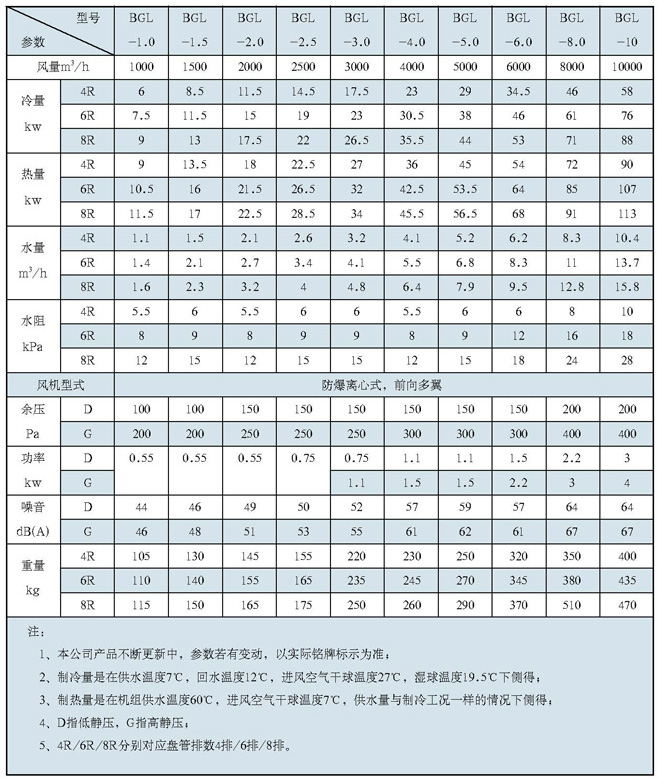 BGXLXX-14/Y/G:名义风量为14000 m3/h、立式、右进水、8排管、高静压防爆新风机组;